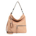 Pehmeä olkalaukku on valmistettu keinonahasta, vuorit ovat tekstiiliä. Etupuolella on vetoketjutasku, samoin takana. Laukku suljetaan vetoketjulla. Mukana on kaksi irrotettavaa hihnaa. Toisen pituus on n. 42 cm ja toisen 89 -160 cm.  Sisäpuolella on vetoketjutasku sekä pieni avotasku. Keskiosa on yhtä tilaa. Laukun korkeus on 32 cm, leveys 32 cm. Pohjan pinta-ala on n. 30*11 cm.